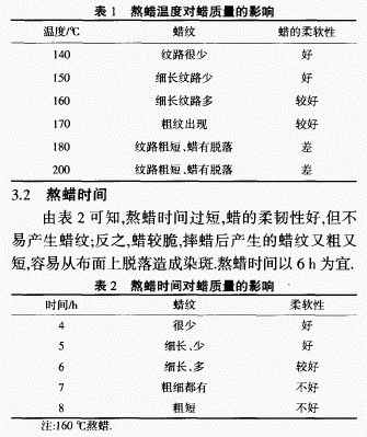 低溫加熱可以把多余的水分都去掉,水的沸點(diǎn)為100℃,所以控溫在100℃左右,經(jīng)過一定時(shí)間的加熱可以去掉剩余的水分-由于回收蠟含水率不一樣,所以加熱去水分的時(shí)間也不一樣.一般控制好甩干脫水,盡量使每一批的脫水條件一致,這樣加熱脫水時(shí)間好控制,加熱脫水完成后開始升溫,但要注意升溫不能太快,否則會影響回收蠟的質(zhì)量.慢慢升溫至160℃左右f2~C/min).熬制蠟的質(zhì)量見表1.在160℃下熬制的蠟冰紋效果較好,當(dāng)熬蠟溫度低于160℃時(shí),蠟柔韌性好,不易龜裂,但難形成蠟紋;若溫度太高,如在180 ℃時(shí)熬蠟,蠟太脆,在摔布過程中蠟易從布面上脫落,蠟紋又粗又短(蠟紋效果差),易造成染疵.