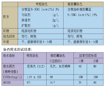 與傳統(tǒng)的染色工藝不同的是,染浴中無任何助劑存在(特別是表面活性劑),染浴中無膠束,纖維表面也沒有表面活性劑吸附層。由于不存在表面活性劑在纖維表面的增溶作用,纖維表面始終只可能有一個單分子層吸附的染料。換句話說,染色結(jié)束后織物上的浮色非常少,染浴中除了完整的空膠囊和濃度極低的溶解染料(幾個ppm)外,再也沒有其他東西。染色排水經(jīng)沉淀或過濾除去膠囊之后就變得清澈了。