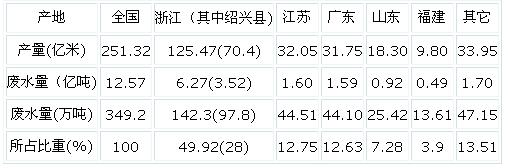 據統(tǒng)計,中國具有一定生產規(guī)模的、有統(tǒng)計資料的印染織物總量2003年為290億米,加上未能統(tǒng)計的小型印染廠,估計總印染量為320億米。按平均印染100米織物產生廢水5噸計,全國每年產生印染廢水約為16億噸。我國印染廢水的產生和分布見表1。