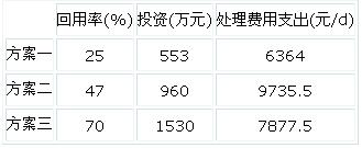 表中數(shù)據(jù)可見(jiàn):方案二回用率適中,投資適中,但處理費(fèi)用支出過(guò)高,一年要比其他方案多支出70~80萬(wàn)元;方案三回用率高,處理費(fèi)用支出尚可,但投資太高,比方案一要多投資近一千萬(wàn)元(約高出兩倍);方案一回用率雖不高,但處理費(fèi)用支出和投資都低。
