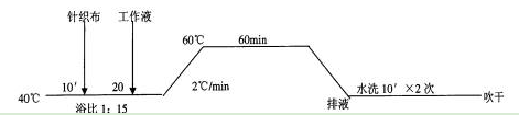 低溫前處理劑I#2g/L,低溫前處理劑II#2g/L,H202(100%)2g/L,NaOH(99%)2g/L。浴比1:15,加布lO’,加料25’升溫10-15’,60"C處理60’。