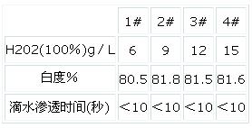 4.1.5水洗溫度對漂白效果的影響。冷堆后水洗溫度是有明顯影響的。冷堆后60℃水洗最后冷洗的毛效不如先70℃水洗,再60℃水洗再冷洗效果好,如果水洗溫度達90℃效果更好,但從節(jié)能角度上來講,我們選擇先70℃再60℃水洗,不用汽蒸。
