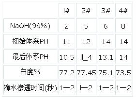 冷堆試驗固定低溫前處理劑I#8g/L,冷堆前處理劑Ⅱ#5g/L,H202(100%)9g/L,調(diào)整NaOH用量發(fā)現(xiàn),NaOH調(diào)節(jié)工作液的PH值是關鍵,當初始濃度為PHll時,最后PH為10.5,白度最好,當初始濃度為PHl0.5時,最后PH值為10.1,白度較好,當初始濃度為PH10.0時,前后PH為9.6,白度有所下降,當初始濃度低于PH9時,最后PH為8.8,白度有明顯下降。