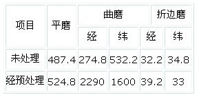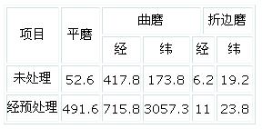 經(jīng)過預(yù)處理的織物各項(xiàng)磨損程度除緯向折邊磨外,均有不同程度的提高。其中曲磨強(qiáng)度提高幅度較大,如經(jīng)向提高733.33%,緯向提高200.63%。