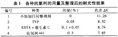 其作用機理主要有兩方面:減少氧與染料分子作用的幾率;轉移氧與染料分子作用的能量。表1是各種抗氧劑用量及整理效果。