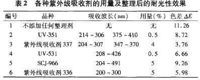 表2中應用的紫外線吸收劑均為二苯甲酮類,其中SCJ-966為混合物。盡管為同一類物質,但效果卻有明顯差異。經(jīng)紫外線吸收劑337整理后,樣品的色差最小,這一定程度上是由于整理后布樣有些泛黃,使樣品色差偏小。另外,這幾種紫外線吸收劑對紫外光的吸收波長有差異,因而對染料的保護程度也不一樣。