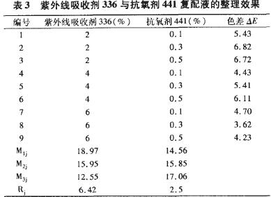 如表3所示,分別使用不同量的紫外線吸收劑336和抗氧劑441配制的整理液,整理效果不同。從極差分析可以看出,在保護染料的光變色中,紫外線吸收劑336的作用要大于抗氧劑441,這說明染料光變色過程中紫外線的破壞力要大于氧。從試劑用量變化時布樣色差的變化趨勢來看,紫外線吸收劑336用量的增加有利于提高染料的耐光性,相反抗氧劑441用量越小效果越好,但是這種趨勢只能說明紫外線吸收劑336的用量要相對大一點,抗氧劑441的用量則稍小一點,編號紫外線吸收劑336(%) 抗氧劑441(%) 色差AE并不能簡單地取前者的最大用量和后者的最小用量進行復配。比較色差數(shù)據(jù)得出,8號試驗方案用量的配比較好,整理后布樣色差值比單獨使用任何一種試劑整理的色差都小得多,表明紫外線吸收劑336和抗氧劑441在適當用量前提下共同使用,才可以發(fā)生協(xié)同效應。