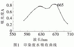 以蒸餾水為空白參比,用2 cm吸收池,在580~ 700 nm間,每隔10 nm測量一次稀釋后的印染廢水吸光度。在峰值附近每間隔2 nm測量一次。以波長為 橫坐標,吸光度為縱坐標,繪制吸收曲線如圖1所示。
