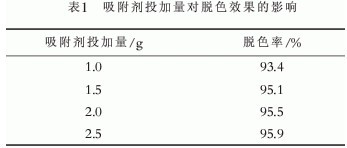 由表1可知,當吸附劑的投加量超過1.5 g的時候,脫色率就達到95%以上,投加量增大到2.5 g,脫色效果變化不大,因此確定吸附劑合適的投加量為 2.0 g。