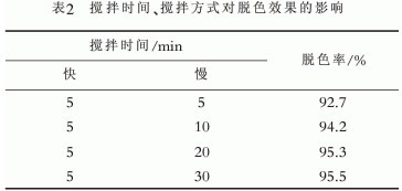 為使染料與吸附劑結合得好,采用了不同的攪拌速度。由表2可知,當快速攪拌時間為5 min、慢速攪拌為20min的時候,脫色率達到95%以上,時間延 長脫色效果變化不大,因此處理攪拌時間為先快5min、后慢20 min。