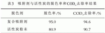 從表3中數(shù)據(jù)可知,在相同工藝條件下,無論是脫色率,還是CODcr去除率,復合吸附劑處理廢水效果要優(yōu)于活性炭粉末。