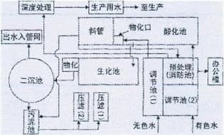 【集萃網(wǎng)觀察】1.2.1無(wú)色廢水處理流程 無(wú)色廢水一格柵一進(jìn)調(diào)節(jié)池(曝氣混合)一泵前加藥進(jìn)斜管沉淀池一初級(jí)回用池(部分水用于消防、綠化及沖洗)一砂濾一炭濾一回用清水池一進(jìn)生產(chǎn)線 1.2.2有色廢水處理流程(按原路線) 有色廢水一格柵一調(diào)節(jié)池一厭氧池一生物接觸氧化池一加藥進(jìn)二沉池一(脫色)一進(jìn)城市管網(wǎng) 1.2.3構(gòu)筑物及主要管線調(diào)整 (1)將車間排放溝內(nèi)的無(wú)色廢水與有色廢水隔斷分流。 (2)把原調(diào)節(jié)池分隔為二,分別存放無(wú)色和有色廢水。 (3)無(wú)色廢水混凝處理后,排入原消防池作為預(yù)處理水,一部分可用于消防、綠化和其它清洗用水;另一部分經(jīng)深度處理后回用于生產(chǎn)。 (4)利用閑置的原水處理中的交換柱,作炭濾和砂濾的設(shè)備。 (5)在調(diào)整各構(gòu)筑物管線時(shí)注意互通,以處理應(yīng)急情況。 (6)為提高有色廢水的生化處理效果,保證回用水的質(zhì)量,將生活污水并入有色廢水處理。 (7)含堿量較高的絲光廢水,可用于冷堆前處理和適當(dāng)外援。調(diào)整后的構(gòu)筑物分布見圖4。 來(lái)源: 印染在線