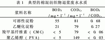 退漿是織物練漂的基礎,是采用酶制劑、酸、堿、氧化劑等化學藥劑將織物上所帶漿料水解成可溶性物質(zhì)而除去的過程?椢锊捎玫矸奂暗矸垩苌餅闈{料的退漿廢水BOD5高,采用生化法可以處理;織物采用聚乙烯醇為漿料的退漿廢水CODCr 高、BOD5低、常規(guī)的處理方法很難處理。典型的棉混紡織物退漿廢水水質(zhì)見表1。