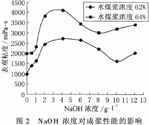 (2)隨著NaOH濃度的增加,水煤漿的粘度表現(xiàn)為先增加到一極大值后,又逐漸降低到某一極小值,而后又略有增加。
