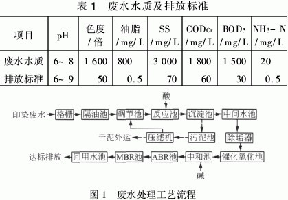 廣東省某印染廠排放的生產(chǎn)廢水主要污染物為 染料、漿料、助劑、油劑、酸堿、纖維雜質(zhì)、砂類(lèi)物質(zhì)、無(wú) 機(jī)鹽等,具有污染物濃度高、成分復(fù)雜、水質(zhì)多變、色 度高、毒性大、難生化降解的特點(diǎn),屬難處理的工業(yè)廢 水,直接排放會(huì)對(duì)環(huán)境造成嚴(yán)重污染。該生產(chǎn)廢水量 為1 000 m3/d,設(shè)計(jì)最大處理能力為1 200 m3/d。出 水執(zhí)行《污水綜合排放標(biāo)準(zhǔn)》(GB 8978—1996 )一級(jí) 標(biāo)準(zhǔn),廢水處理后回用于車(chē)間設(shè)備清洗、綠化、地面沖 洗等,具體廢水水質(zhì)及排放標(biāo)準(zhǔn)見(jiàn)表1。經(jīng)過(guò)分析 此廢水的特點(diǎn)和對(duì)比處理試驗(yàn)效果,從處理效果 和處理成本等綜合考慮,決定采用酸解沉淀—催化氧化—ABR—MBR工藝(見(jiàn)圖1)。