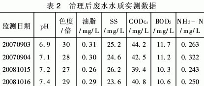 該工程2007年5月竣工后,經(jīng)試運(yùn)行3個(gè)月,于9月正式投入正常運(yùn)行,從運(yùn)行1年的情況來(lái)看,系統(tǒng)運(yùn)行穩(wěn)定、處理效果顯著,出水水質(zhì)良好,經(jīng)環(huán)境監(jiān)測(cè)站在不同的時(shí)期測(cè)得出水水質(zhì)各項(xiàng)指標(biāo)均己達(dá)《污水綜合排放標(biāo)準(zhǔn)》(GB 8978—1996)一級(jí)排放標(biāo)準(zhǔn),測(cè)得的部分結(jié)果如表2所示。