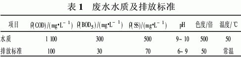 該廠排放的生產(chǎn)廢水中,污染物主要來(lái)自產(chǎn)品的印花、染色和漂洗工序,原水中含有較高的有機(jī)物、懸浮物等,顏色較深,水溫偏高,水質(zhì)多變。設(shè)計(jì)處理后水質(zhì)達(dá)到國(guó)家環(huán)境標(biāo)準(zhǔn)GB4287—1992《紡織染整工業(yè)水污染排放標(biāo)準(zhǔn)》的一級(jí)排放標(biāo)準(zhǔn)。其水質(zhì)及工程排放標(biāo)準(zhǔn)見(jiàn)表1。
