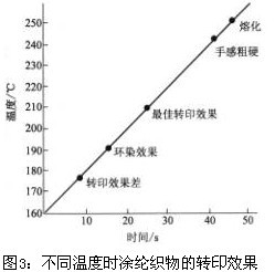 【集萃網(wǎng)觀(guān)察】滌綸轉(zhuǎn)移印花時(shí),溫度對(duì)滌綸的影響很大。在180℃以下時(shí),轉(zhuǎn)移效果很差,190℃左右,轉(zhuǎn)移印花能產(chǎn)生纖維有白芯的環(huán)染現(xiàn)象。在210℃左右,一般能獲得最佳轉(zhuǎn)印效果,超過(guò)240℃到達(dá)滌綸軟化點(diǎn),可造成織物手感粗硬。達(dá)到258℃為滌綸熔點(diǎn),此時(shí)織物已不成形,失去使用價(jià)值,如圖3。