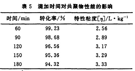 2.1.4 滴加時(shí)間對(duì)共聚物性能的影響 由表5可知,丙烯酸、引發(fā)劑和去離子水混合液的滴加時(shí)間越長,聚合物的產(chǎn)率越低,特性粘度越大.由于聚合反應(yīng)為自由基反應(yīng),滴加時(shí)間越短,則單位時(shí)間內(nèi)滴人溶液中的引發(fā)劑量越多,越易進(jìn)行多頭引發(fā)聚合,聚合速度加快,相同時(shí)間內(nèi)聚合更趨于完全,而多頭聚合導(dǎo)致聚合物相對(duì)分子質(zhì)量下降,即聚合物的特性粘度降低.
