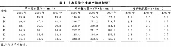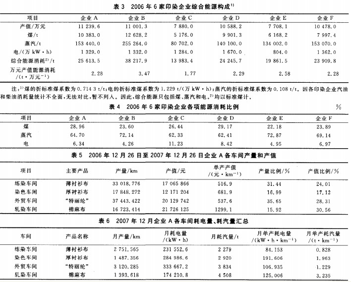 調(diào)查了紹興地區(qū)的6家印染企業(yè)A~F。其中,企業(yè)A主要生產(chǎn)名牌產(chǎn)品“特麗綸”和襯衫布,以棉印染為主;企業(yè)B既有染色又有印花,以棉麻軋染染色為主;企業(yè)C以氣流染色為主導(dǎo)工藝;企業(yè)D以襯衫布漂白為主,深度染色只占總產(chǎn)量的30%;企業(yè)E以印花工藝為主,染色生產(chǎn)線對(duì)外承包;企業(yè)F的主要生產(chǎn)車間是化纖車間和棉線車間,化纖車間以化纖、仿真織物等坯布的染色、漂白加工為主,主要生產(chǎn)工藝是浸染,棉線車間以麻棉坯布的軋染染色為主。