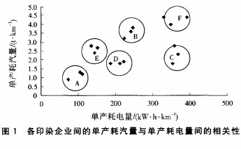 蒸汽是紡織印染企業(yè)能源成本最大的一種能源。從表I可以看出,企業(yè)F的單產(chǎn)耗汽量最大,其次是企業(yè)B和企業(yè)E。除了企業(yè)A、C外,其他各印染企業(yè)在不同年份的單產(chǎn)耗汽量基本穩(wěn)定。從圖1可以看出,除了企業(yè)C外,印染企業(yè)的單產(chǎn)耗汽量與單產(chǎn)耗電量間的相關(guān)性較好,這反映出印染企業(yè)的節(jié)電與節(jié)汽在節(jié)能工作中應(yīng)同步跟進(jìn);各印染企業(yè)近3年的指標(biāo)分散度差異較大,企業(yè)B、E、D相對(duì)較集中,可能是他們近3年節(jié)能工作力度不夠。