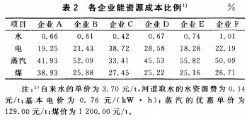 按照2007年的計(jì)費(fèi)標(biāo)準(zhǔn),對(duì)各印染企業(yè)的能資源成本進(jìn)行了估算,結(jié)果見表2。其實(shí),實(shí)際計(jì)算更復(fù)雜,比如電價(jià)均實(shí)行峰谷計(jì)價(jià)等,但表2估算數(shù)據(jù)與實(shí)際成本相差不大。從表2可以看出:(1)各印染企業(yè)的能資源成本比例(能資源成本占能資源總成本的比例)相差較大。(2)當(dāng)?shù)睾泳W(wǎng)密布,水資源較豐富,取水一般都是直接從附近河道抽取,因此僅需繳納水資源費(fèi),水成本比例一般不超過19/6(除企業(yè)F外)。當(dāng)然,如果把印花調(diào)漿、生活用水等水質(zhì)要求高的自來水算進(jìn)來,則水成本應(yīng)該會(huì)提高。另需注意的是,取水還伴隨有給水預(yù)處理,并且有相當(dāng)數(shù)量的廢水產(chǎn)生,因此廢水處理費(fèi)用與取水量直接相關(guān)。(3)各能資源成本比例中,總體上蒸汽成本比例最高(50%左右),其次為煤成本比例(25%左右)。(4)較特殊的是企業(yè)C,其電成本比例最高,這與其單產(chǎn)耗電量大(見表1)有關(guān);企業(yè)C的外購蒸汽量不大,成本比例是6家印染企業(yè)中最低的,其中一個(gè)原因是該企業(yè)最早對(duì)所有的導(dǎo)熱油鍋爐安裝了余熱蒸發(fā)器,充分利用了煙氣余熱產(chǎn)生蒸汽回用于生產(chǎn),另一個(gè)原因是該公司引進(jìn)了II臺(tái)氣流染色機(jī)在蒸汽、水等消耗方面有較大幅度節(jié)省。(5)企業(yè)A的煤成本比例在所有印染企業(yè)中最高,原因是該企業(yè)有多臺(tái)小型分散的鍋爐,熱效率不高、耗煤量大。