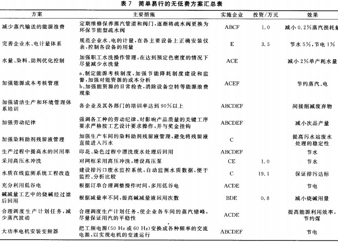 改進(jìn)生產(chǎn)工序及設(shè)備、提高企業(yè)的運(yùn)行管理水平、加強(qiáng)參數(shù)在線監(jiān)控、促進(jìn)廢物循環(huán)再利用等手段是紡織印染行業(yè)實(shí)現(xiàn)節(jié)能減排和提高產(chǎn)量的主要途徑。通過走訪調(diào)查,將各印染企業(yè)節(jié)能減排的中高費(fèi)方案匯總列入表8。