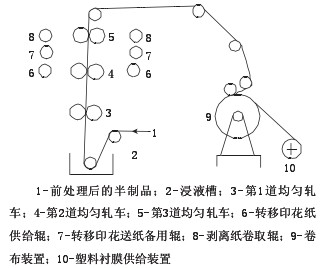 如圖1所示。該機(jī)占地面積。s5m×7m),其主機(jī)底為一浸槽2,垂直依次裝有三臺(tái)均勻軋車。一對(duì)轉(zhuǎn)移印花紙供給輥6和一對(duì)送紙備用輥7,還有一對(duì)卷取輥8(用于轉(zhuǎn)印后剝離紙的卷取),這些輥筒分布在第2道均勻軋車4及第3道均勻軋車5的兩側(cè)。織物以20~30m/min的車速通過(guò)浸液槽,浸漬工作液后向上運(yùn)行進(jìn)入第1道均勻軋車3,軋液后與轉(zhuǎn)移印花紙復(fù)合后進(jìn)入第2道均勻軋車,再上行進(jìn)入第3道均勻軋車。此時(shí)特殊的轉(zhuǎn)移印花紙經(jīng)均勻加壓后,將活性染料在常溫濕轉(zhuǎn)移印上織物,轉(zhuǎn)印的紙經(jīng)第3道均勻軋車后被剝離卷取。轉(zhuǎn)印織物通過(guò)導(dǎo)布輥進(jìn)入有塑料薄膜襯墊的打卷裝置9,打卷的織物在室溫下堆置12~20h,充分固色后用三格熱水洗去除浮色,烘干拉幅,不必蒸化退漿,因此無(wú)色漿污水。與常規(guī)印花比較,能耗節(jié)約50%,用水量很少,染色牢度無(wú)論中、厚、稀、薄棉織物或真絲綢,各項(xiàng)牢度均優(yōu),得色濃艷,花紋精細(xì),還可轉(zhuǎn)印藝術(shù)品花型,可用于羊毛織物的轉(zhuǎn)移印花(須加強(qiáng)前處理)。