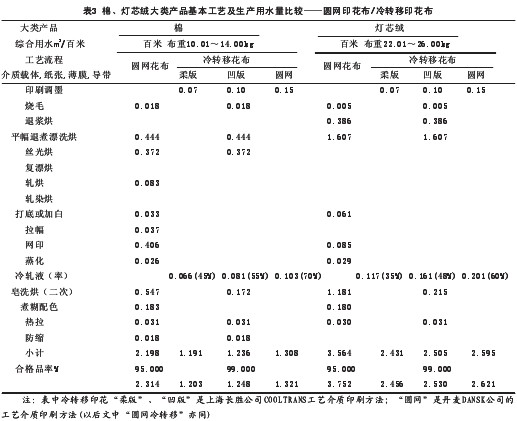 表3中,無(wú)論棉布印花,還是燈芯絨印花,百米耗水皆為圓網(wǎng)印花高于冷轉(zhuǎn)移印花,由于合格品率圓網(wǎng)印花要差4%,因此,最終的百米印花取水更高;圓網(wǎng)印花過(guò)程,“網(wǎng)印”與“皂洗烘”是耗水差額焦點(diǎn);冷轉(zhuǎn)移印花三種介質(zhì)載體印刷,圓網(wǎng)冷轉(zhuǎn)移耗水略高。