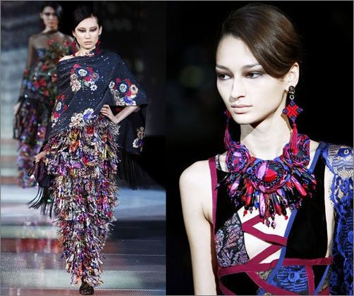 08秋冬時裝周的米蘭,Giorgio Armani秀場上的模特們穿著流蘇印花長裙,裹著波西米亞風(fēng)格的蕾絲刺繡披肩款款走來。數(shù)月后的羅馬,gucci 2009春季度假系列被鼓脹的大袖子和飄逸的印花雪紡長裙主宰著,模特們仿佛是不斷旋轉(zhuǎn)起舞的吉普賽女郎。