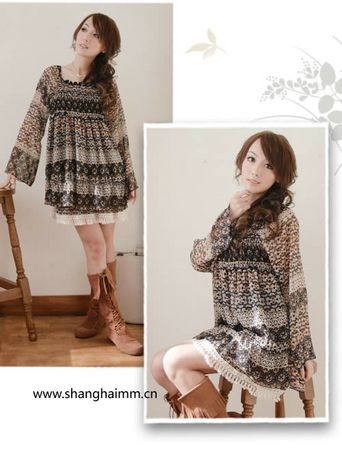 今年最夯的波西米亞風甜美印花雪紡洋裝在冬季依然熱賣,采用了輕柔的雪紡材質,飽滿的顏色圖案,內里下擺為流蘇設計,呈現(xiàn)出異國時尚層次感;伸縮領口+胸圍,自由變換一字領、圓領,還有up up的視覺效果哦!稍寬的袖型更顯浪漫的異國情調;外面穿搭厚大衣或軍裝外套,雪紡洋裝與長大衣的混搭組合,再加上長靴后,時尚感逼人,是今季日本女孩的最IN裝扮!