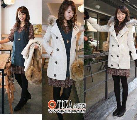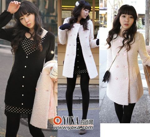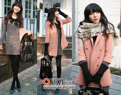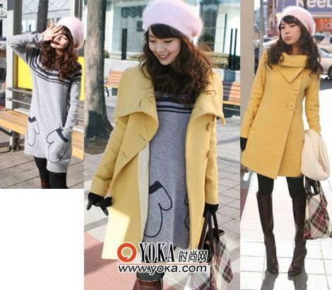 點(diǎn)評:將口袋設(shè)計(jì)成手套的樣子非?蓯,搭配黑色絲襪和長筒靴可以讓你的腿部看起來更纖細(xì)。外塔黃色的大衣與可愛的氣質(zhì)相符,也能提亮全身,讓他對你投注更多的注意力。