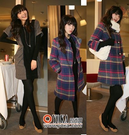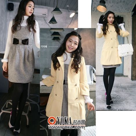 點(diǎn)評:黑白格的束腰連衣裙前面點(diǎn)綴以可愛的蝴蝶結(jié)讓人愛不釋手,內(nèi)搭的白色高領(lǐng)打底衫袖口裝飾著可愛的絨毛,相信你的他會(huì)忍不住牽你的手哦!~像陽光般耀眼的黃色大衣為暗淡的冬季帶來熱量。