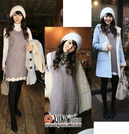 點(diǎn)評:灰色的直身針織裙打造出溫柔的形象,讓人覺得你是家中最討人疼愛的嫻慧嬌妻。裙擺的白色裝飾雖然不很起眼,但勝在精致,也是不可缺少的細(xì)節(jié)。淺藍(lán)色的翻毛大衣有點(diǎn)可愛也有點(diǎn)豪爽,視覺上也讓人覺得格外溫暖。