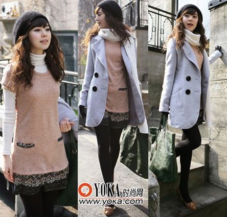 點(diǎn)評:裙擺處有性感黑色蕾絲邊的大地色連衣裙充滿少女的活力與青春魅力。西裝款風(fēng)格的藍(lán)灰色大衣讓你看起來更加成熟穩(wěn)重,適合進(jìn)出辦公室。