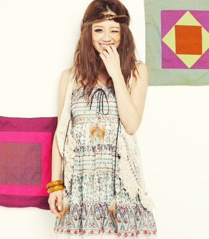 碎花連衣裙+淺色牛仔馬甲 粉嫩的碎花連衣裙+淺色牛仔馬甲,一點(diǎn)點(diǎn)名族元素的小物,讓定番搭配也有新意。