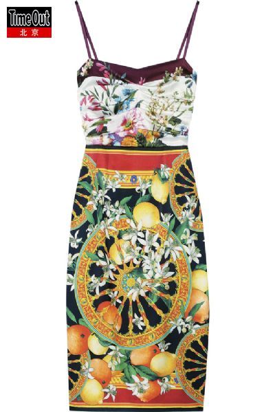 繁復(fù)華麗的鮮花和寫實(shí)主義的水果,組合在一起有強(qiáng)烈的視覺沖突;彈力真絲的緞子面料,充滿了復(fù)古宮廷風(fēng)。