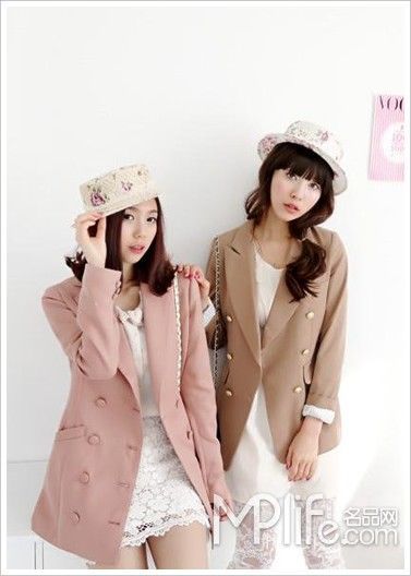 蕾絲短裙和蕾絲leggings都是春季首選的蕾絲單品,搭配裸色系排扣西裝外套,打破深色定律,帶來清純新體驗。
