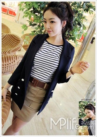 西服搭T恤是最簡單的搭配也就是最實用的,沒有過多的修飾和繁冗的層疊。海軍風(fēng)的條紋T恤算是今年春夏最流行的T恤款式之一,加上休閑半身裙為職業(yè)的雙排扣西服帶來清新的休閑風(fēng)格。