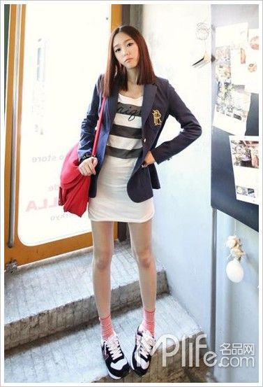 帶徽章的西服和條紋T恤搭配就是標(biāo)準(zhǔn)的學(xué)院范兒,但是要搭出大牌的味道還是需要一兩件配飾才能做到,例如紅色大挎包或者禮帽圍巾之類。