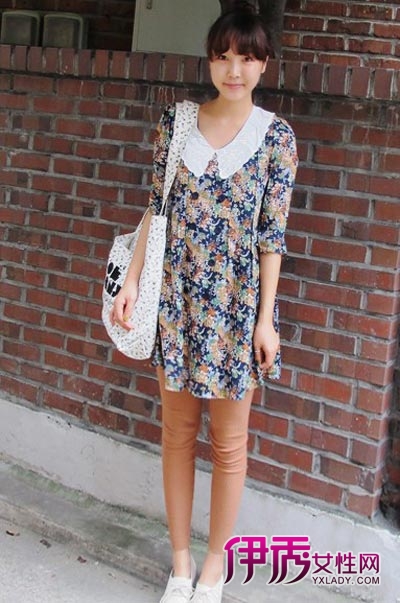 很喜歡白色蕾絲領(lǐng)子設(shè)計(jì),拼接印花連衣裙,乖乖女的形象很甜美哦