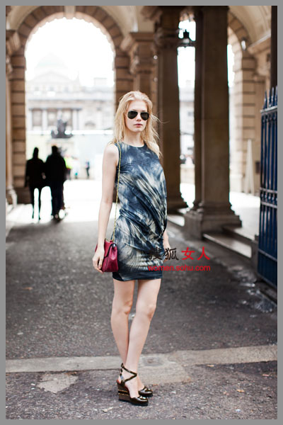 小編點評:熒光色的水墨感連衣短裙,款式上雖然沒有太大新意,但是扎眼的色彩讓人過目難忘。搭配一雙低調(diào)的高跟鞋,實在很獨特。