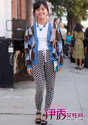 格菱紋很有學(xué)院氣息,搭配波點緊身leggings簡中有繁,搭配簡單的皮涼鞋很有feel。