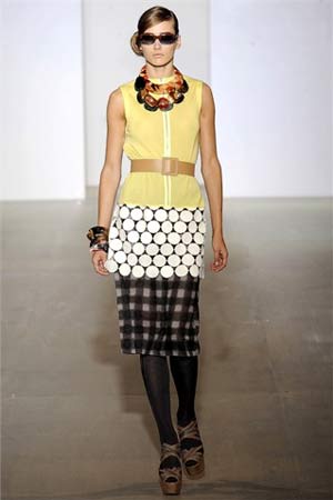 最搶眼的要數(shù)混搭風(fēng)格的巧妙運(yùn)用,大量拼接的圓點(diǎn),菱形、方格圖案,水果及花朵底紋,運(yùn)用自如。藏青的大圓點(diǎn)圖案上衣,配上一條白色菱形圖案的職業(yè)裙,寬寬的腰帶束身,一件絲綢質(zhì)感的墨綠外套外搭,清新又飄逸,精致而有趣。