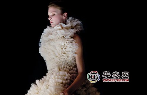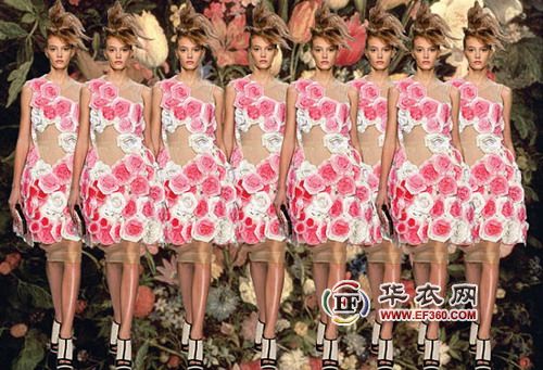 繪在身上的花朵一定沒有Giambattista Valli這種視覺沖擊力,花朵擁擠地、立體地布滿整條禮服裙。它比Hussein Chalayan那種被修剪成樹塔狀的裙子更顯現(xiàn)出“經(jīng)濟型的美”。