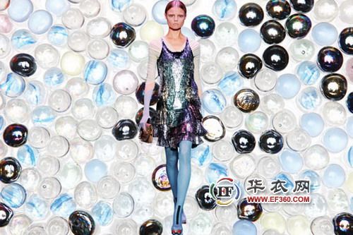 燈光暗下去,現(xiàn)在是DISCO時間。這一季的派對裝,要絢麗多彩,要金光閃閃,要迷幻!在2009春夏 Balenciaga的秀場上,當模特走上T臺時,他們頭頂上的燈束就一直跟隨著,燈光變化的顏色就像Disco舞廳里的雷射光,服裝的特殊面料感受著燈光變化的顏色,就像太陽能電池板一樣,特別是那組閃亮的裙裝,直接就可以穿到Disco舞池里狂High。盡管模特嚴肅,但是電子感的“Sci-Fi Couture”(科技時裝)也Disco時代的最重要特征。