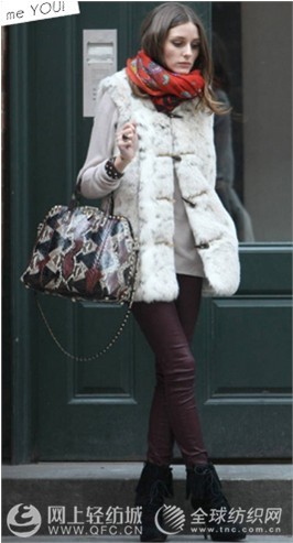 時尚解析:暗紅色皮褲搭配針織衫、皮草馬甲和流蘇靴,暗紅皮褲較于黑色多了一分女性的嫵媚,搭配高跟靴,腿部線條更加修長,紅色印花圍巾起著提亮作用。