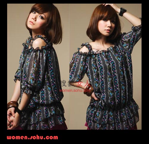 搭配建議:浪漫甜美的一字荷葉肩帶碎花雪紡洋裝,以典雅的雪紡花卉圖樣突顯女人的優(yōu)雅氣質(zhì),舒適彈性的一字領(lǐng)收腰設(shè)計讓您的身材曲線更顯窈窕多姿,展現(xiàn)當(dāng)今都市女性的柔情魅力!