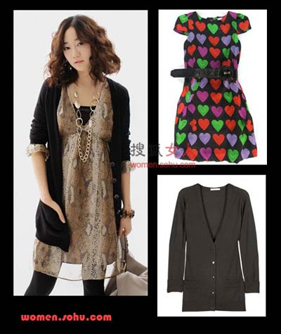 搭配Tips:桃心形狀印花連身裙+中長(zhǎng)針織衫
