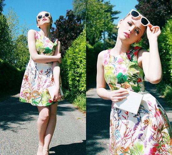 顏色亮麗的印花連身洋裝讓人眼前一亮,合身的收腰設計凸顯了纖細的腰部線條。一雙裸色涼鞋更是加強了雙腿的延伸感,極好地修飾了身材比例。
